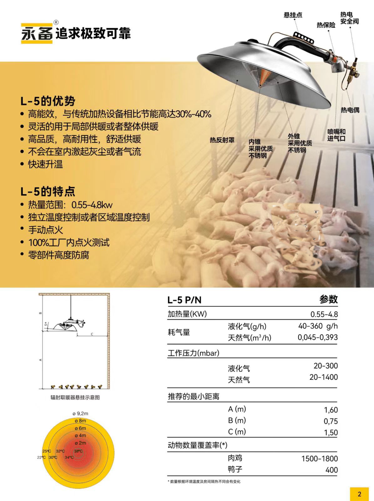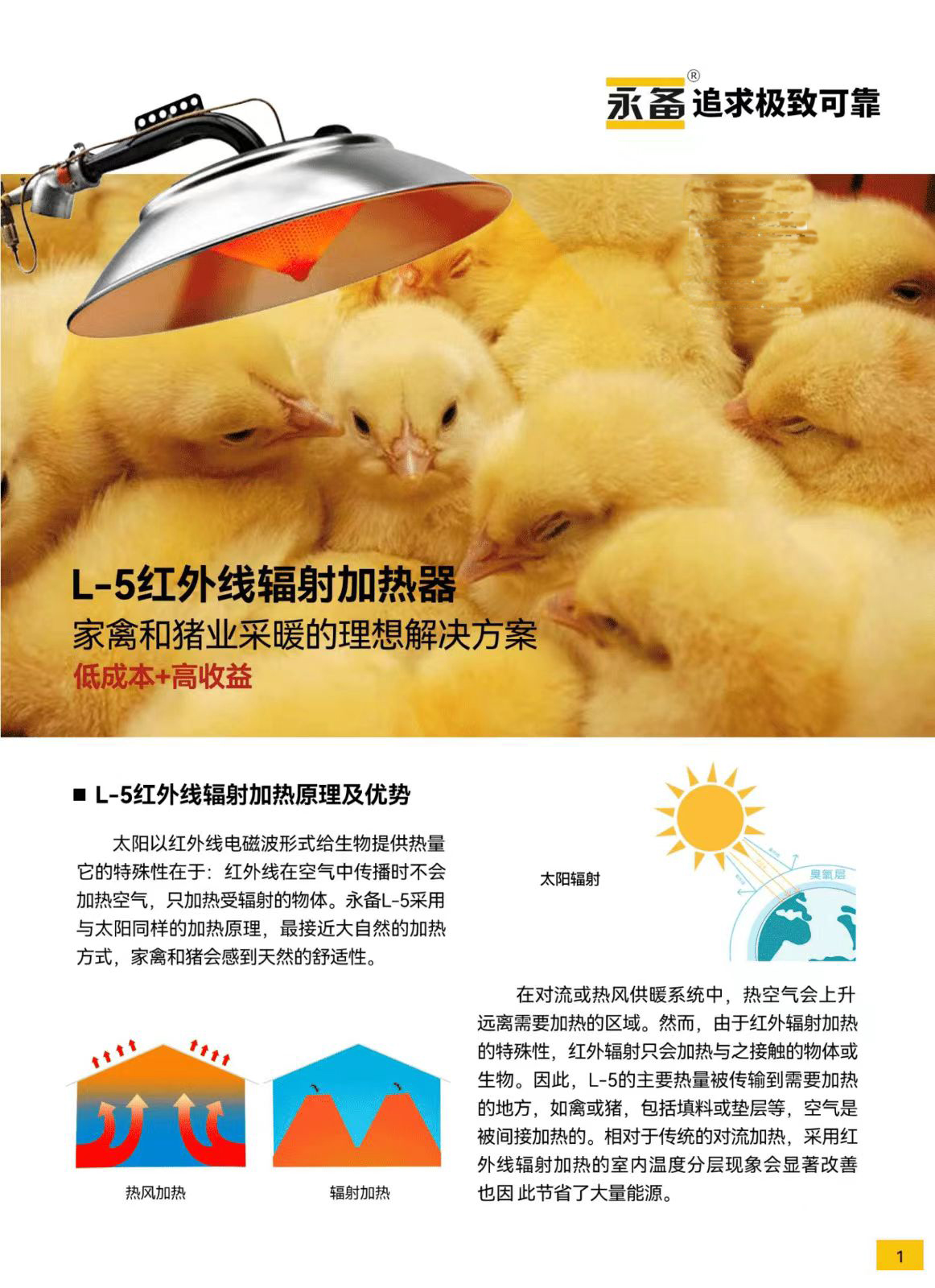 永备L-5采用与太阳同样的加热原理,接近大自然的加热方式,家禽和猪会感到天然 的舒适性。