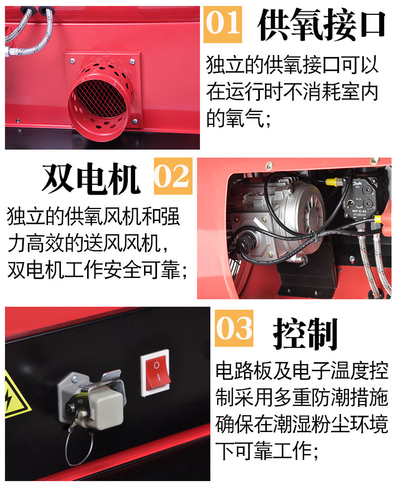2.燃烧产出的热量通过热风机后部的强力风机把热量吹出