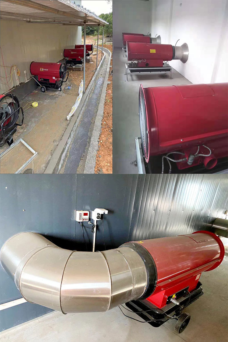 为猪舍、禽舍提供持续供暖,比如黑龙江冬季猪舍用的55KW暖风机。