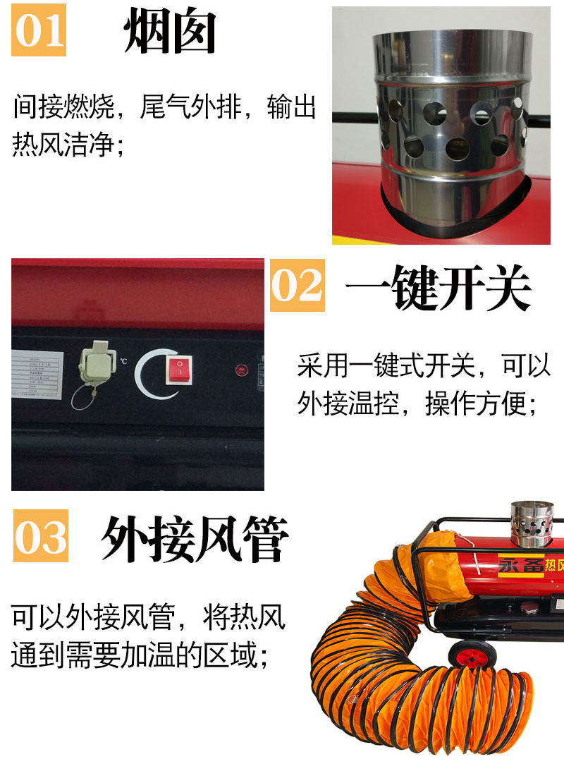 燃油热风机-DH25PV,燃料为柴油或者煤油,不锈钢筒形换热器,分离尾气,输出热空气洁净,自动电子点火