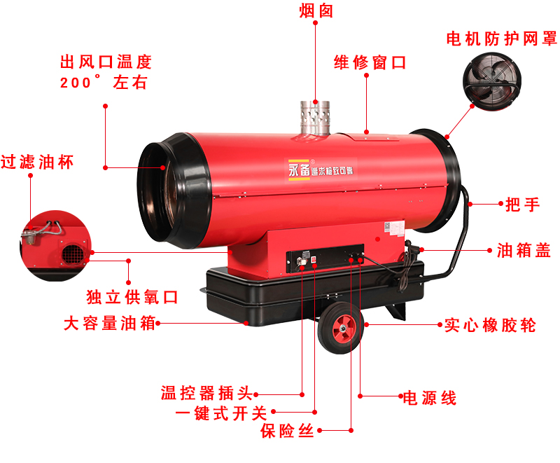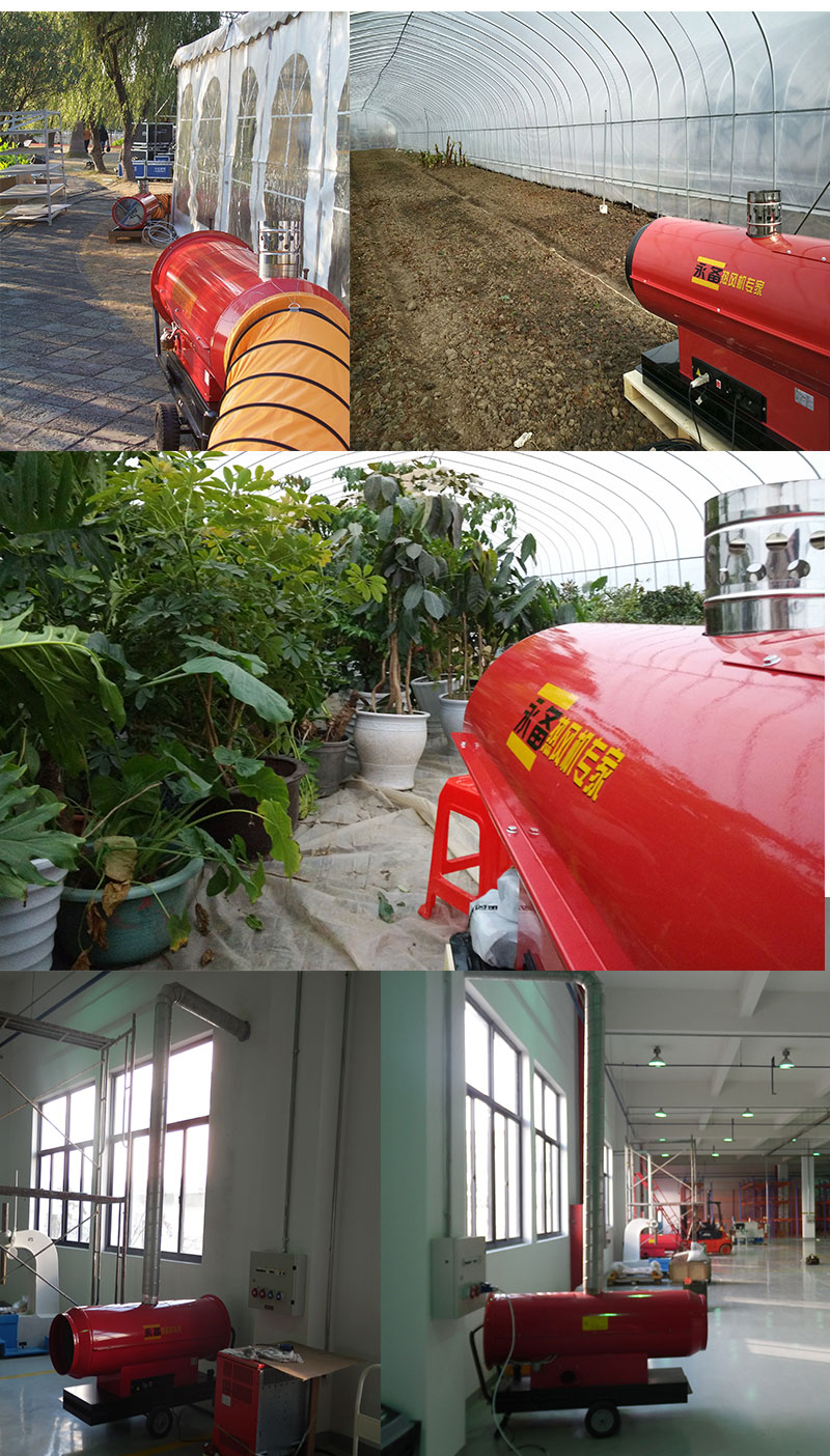 1.柴油或煤油用作燃料。燃烧产生的热量由热风机后部的强力风扇排出。采用清洁燃烧技术,充分燃烧燃料,减少有害物质