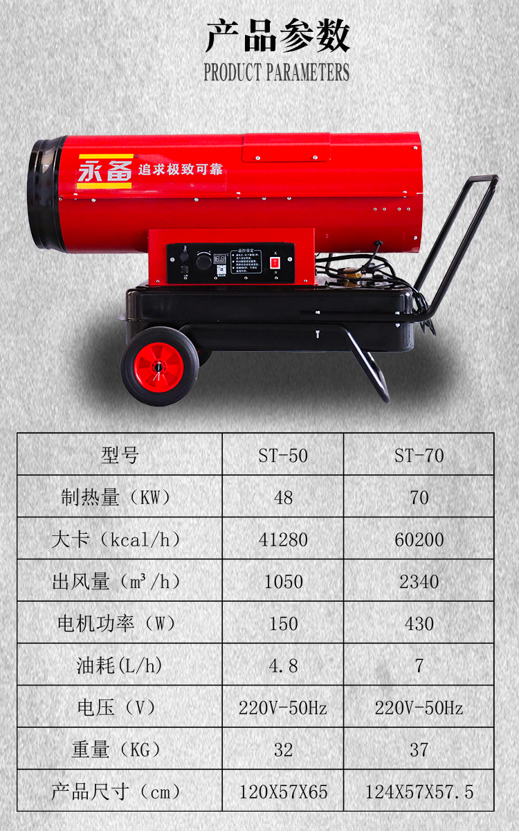 1.ST50采用柴油或煤油为燃料,机器后部的强力风机将燃烧产生的热量吹出