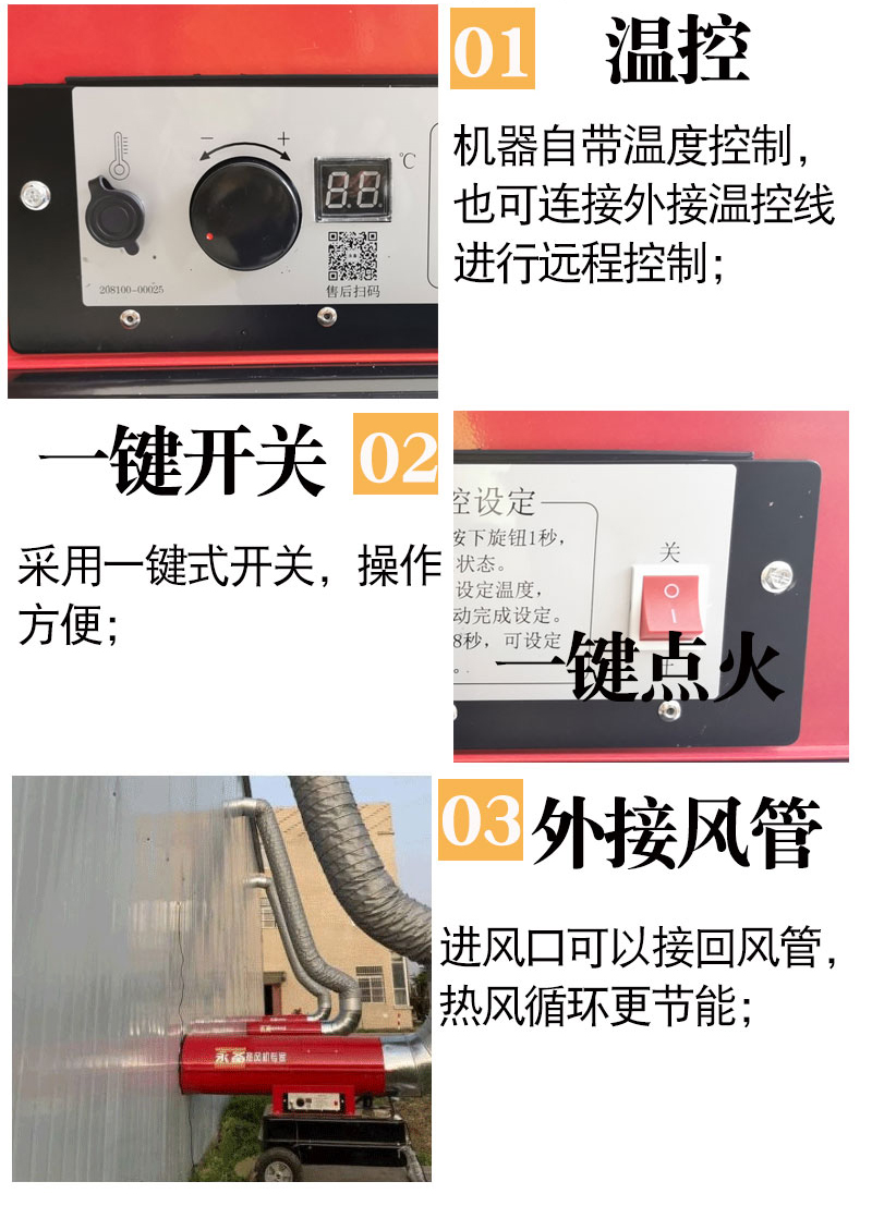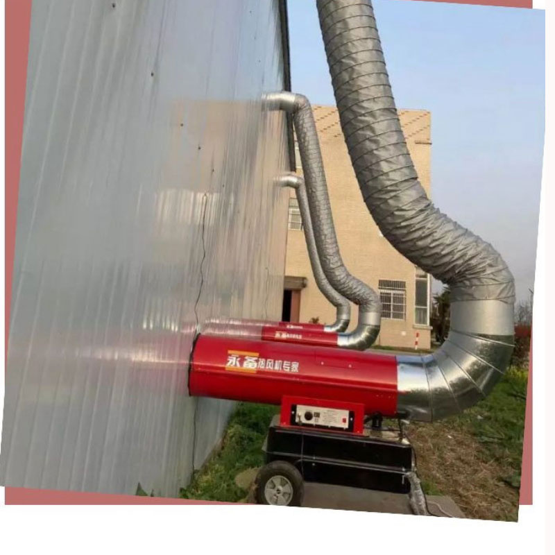 为猪舍、禽舍提供持续供暖,比如黑龙江冬季猪舍用的55KW暖风机。