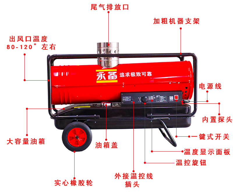 燃油热风机-DH25PV,燃料为柴油或者煤油,不锈钢筒形换热器,分离尾气,输出热空气洁净,自动电子点火