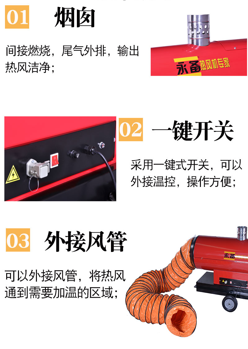 1.柴油或煤油用作燃料。燃烧产生的热量由热风机后部的强力风扇排出。采用清洁燃烧技术,充分燃烧燃料,减少有害物质